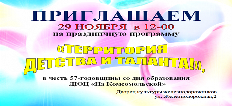 Приглашаем 29 ноября на праздничную программу "Территория детства и талантов", посвященную 57-й годовщине со дня основания Детско-юношеского центра «На Комсомольской»! Вас ждет яркая программа, наполненная т...