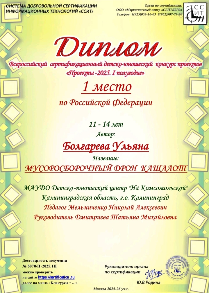 Поздравляем Болгареву Ульяну, учащуюся студии технического моделирования "ТехУспех" ДЮЦ "На Комсомольской" ставшей Победителем по Российской Федерации в возрастной категории 11-14 лет
