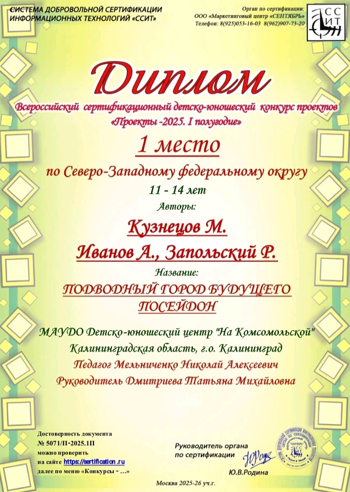 А вот команда ребят Кузнецов Михаил, Иванов Александр, Запольский Ростислав, заняли 1 место по Северо-Западному федеральному округу.
