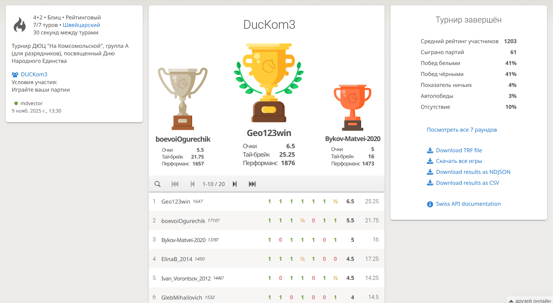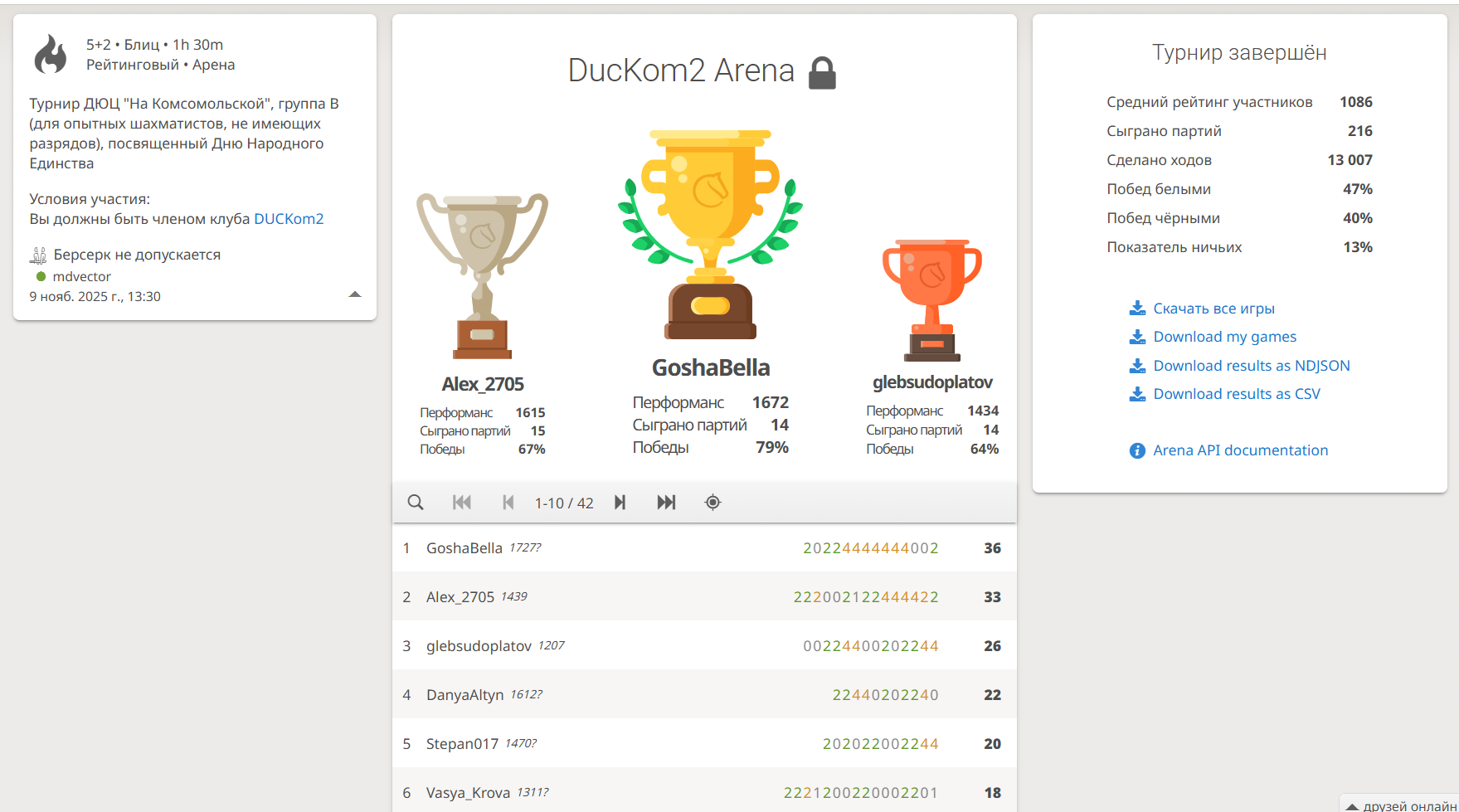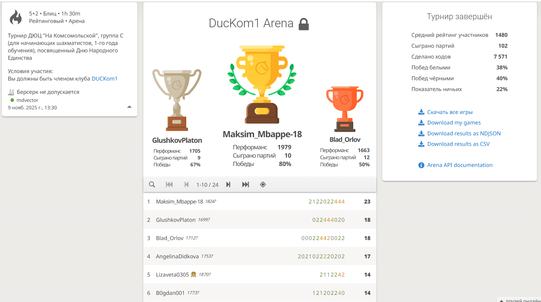 9 ноября на шахматном ресурсе lichess.org прошёл Блиц турнир по шахматам, посвященный Дню Народного Единства. В соревновании приняли участие 84 спортсмена из шахматных студий: «Белая ладья», педагог Ситников В.А., «Шахматное королевство», педагог Калинников Д.С., «Королевский гамбит», педагог Валеева Г.Ф.