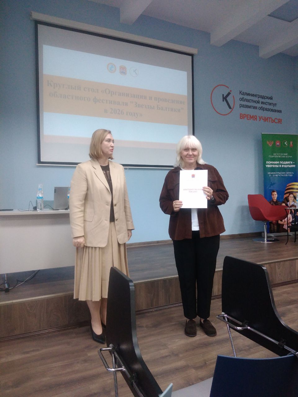 16 сентября в Калининградском областном институте развития образования в рамках августовского педагогического форума состоялся круглый стол по теме: «Организация и проведение областного фестиваля «Звезды Балтики» в 2026 году». С приветственным словом к участникам круглого стола обратилась начальник департамента дополнительного и профессионального образования, безопасности образовательного процесса Министерства образования Калининградской области Барковская Лариса Юрьевна. С итогами проведения Фестиваля в 2024-2025 г. познакомила Ольга Николаевна Тенешева, главный специалист по учебно-методической работе учебно-методического центра духовно-нравственного образования и воспитания Калининградского областного института развития образования. В рамках круглого стола за организацию и проведение мастер-классов в рамках Гала-концерта Фестиваля 01 июня 2025 года наградили активных педагогических работников. Благодарственные письма Министерства образования Калининградской области вручили педагогам дополнительного образования Детско-юношеского центра «На Комсомольской» Евлановой Светлане Анатольевне, Крымской Галине Анатольевне. Поздравляем!