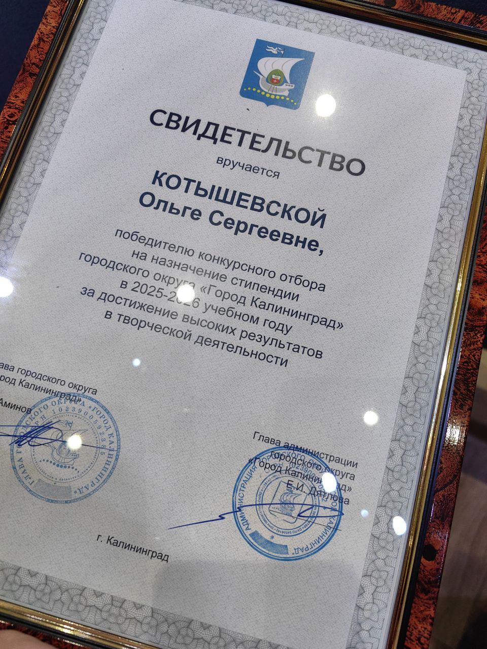 14 ноября состоялась торжественная церемония вручения свидетельств победителям конкурсного отбора на соискание стипендии Главы городского округа "Город Калининград". За успехи в творческой деятельности 20 обучающихся учреждений дополнительного образования города Калининграда были удостоены стипендий.