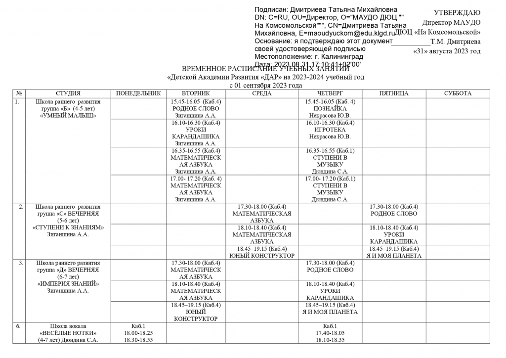 Расписание учебных занятий "Детской Академии Развития" на 2025-2026 учебный год