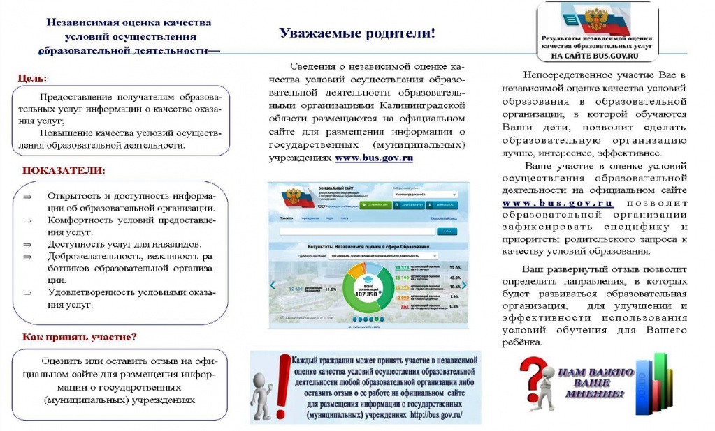 Сведения о независимой оценке качества условий осуществления образовательной деятельности образовательными организациями Калининградской области размещаются на официальном сайте для размещения информации о государственных (муниципальных) учреждениях www.bus.gov.ru.
